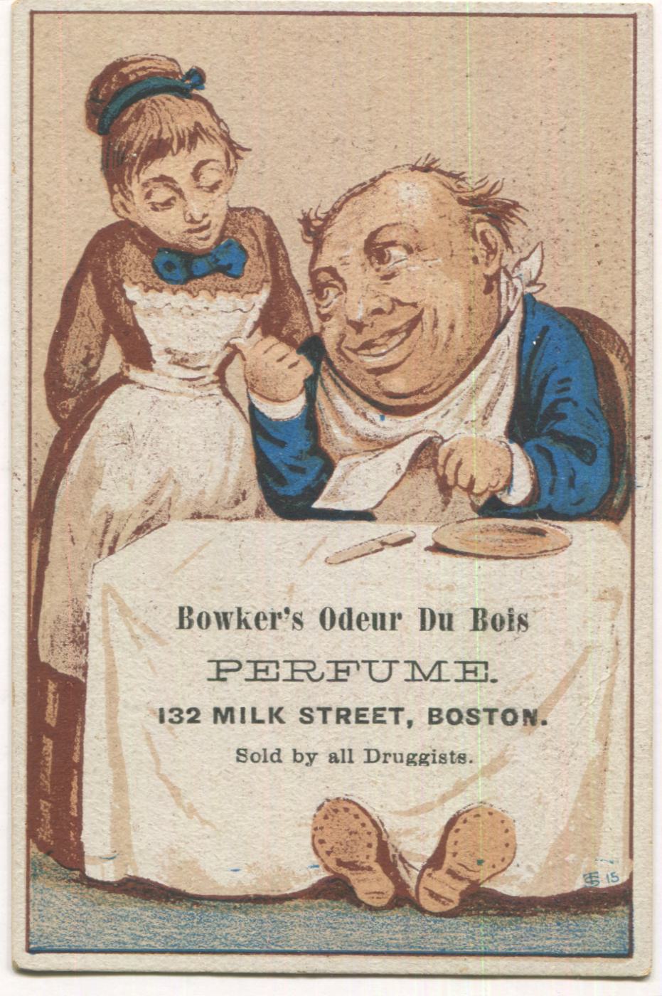 Bowker's Ordeur Du Bois Perfume, Boston, MA Antique Lithographed Trade Card