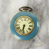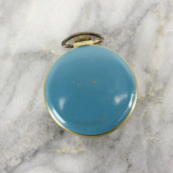 This antique pocket watch is made of brass and features painted or enameled blue coloring around the watch face and on the back. I was unable to get the back off to verify the age and make of this watch, and did not want to damage it by forcing it. However, the watch winds smoothly and runs as it should, with a nice loud tick. There are some age spots in the brass, along with some wear in the brass and in the blue paint.