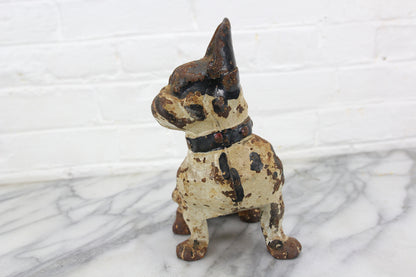 This antique cast iron Boston Terrier dog door stop is loaded with charm. It features heavily worn and rusted white, black, and red paint with heavy crazing, which gives it tons of character. Some may criticize this statue's condition, but I think its just how you want it to look! You be the judge - see the photos for the most complete description. No discernible maker's mark, but could possibly be by Hubley.