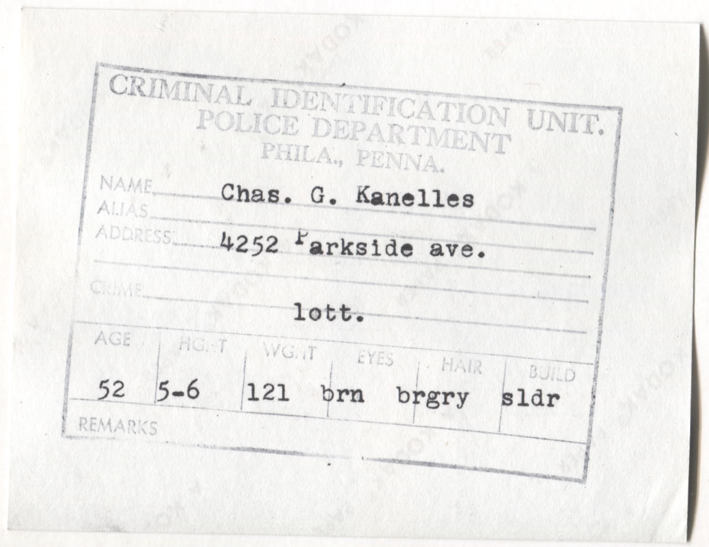 Chas G. Kanelles Mugshot - Arrested on 2/7/1964 for Illegal Lottery