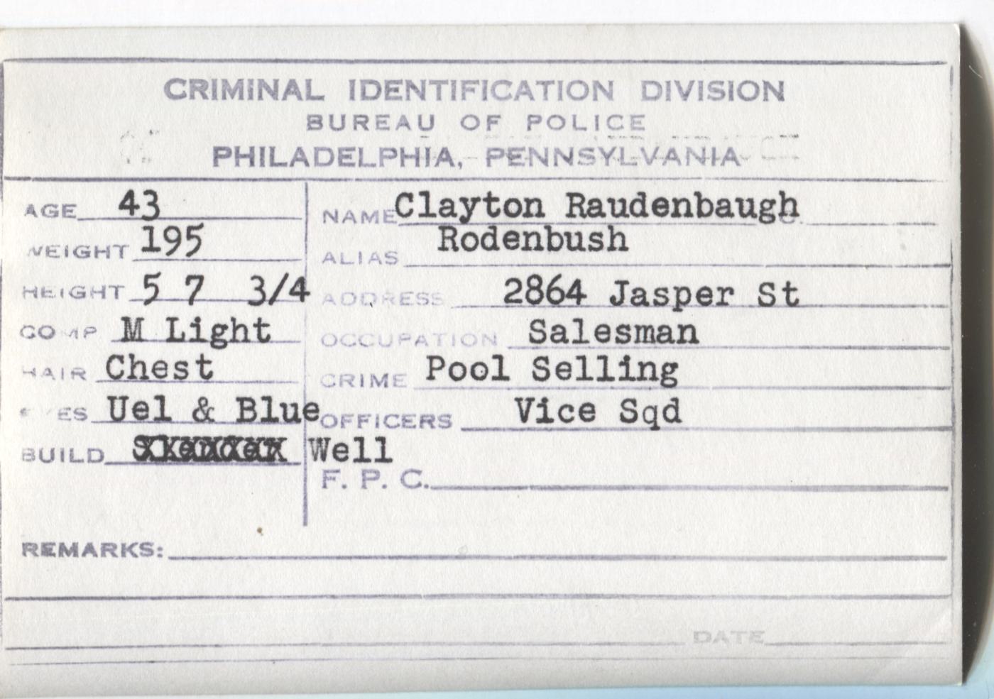 Clayton Raudenbaugh Mugshot - Arrested on 11/8/1948 for Poolselling