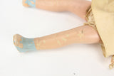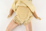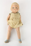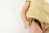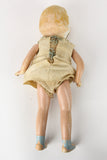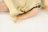 Here is a super cute small-sized composition baby girl doll with lovely painted blonde hair and a silky dress with lace undergarments. This doll is fully composition including her head, torso, arms, and legs. The head and torso are one piece. She has painted on blue shoes and socks. There is some heavy wear in the composition and paint on this doll, especially on the sides and top of her head, along with some wear on her fingers. This doll measures 10" from head to toe.