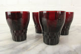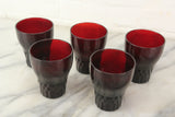 Here is a stunning set of five vintage cranberry glass drinking cups with an art deco influenced design. The bases of each cup feature a distinctive geometric pattern. The cups have a lovely deep red translucent color. They are in good condition with no chips, cracks, or breaks. They should be cleaned prior to use.