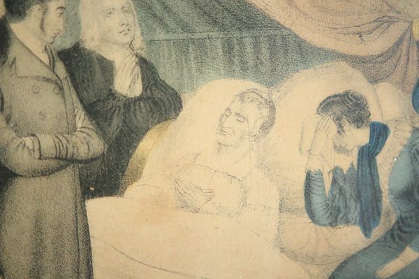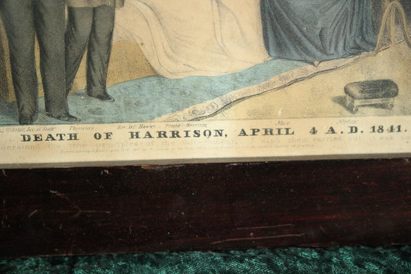 Here is an antique hand colored lithograph published by N. Currier out of New York. It is entitled "Death of Harrison, April 4 A.D. 1841" and depicts President William Henry Harrison on his death bed surrounded by family, doctors, and officials. It is emblazoned with the quote, "I wish you to understand the true principles of the government. I wish them carried out. I ask nothing more."