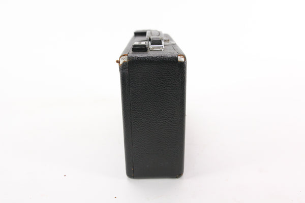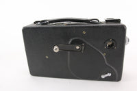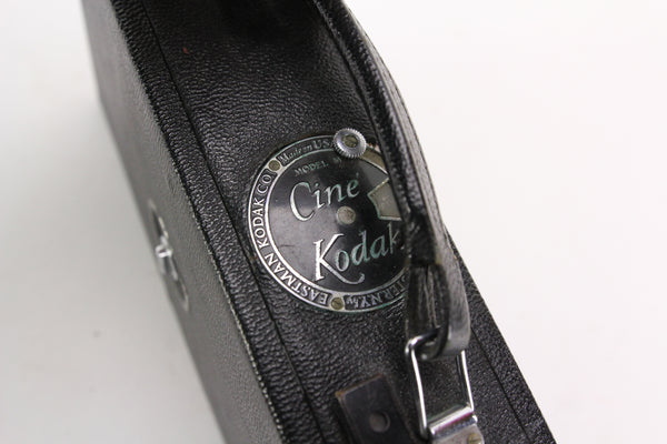 Here is a great vintage Eastman Kodak Cine Kodak 16mm movie film camera. It features a leatherette covering, intact leather handle, and an f/3.5 to f/16 lens. The camera appears to wind and run normally. There is some minor wear to the leatherette coating, including minor losses to the rear corners.