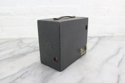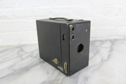 This antique No. 2-C Brownie Model A box camera was manufactured by Eastman Kodak in Rochester, New York, United States. The camera lists the earliest patent date as October 6, 1914, and the most recent as March 21, 1916. This camera appears to be in very good condition for its age, both inside and out. It is quite clean but does show some signs of use and wear. The leather handle on top of the camera is intact. This camera uses film No. 130. The shutter appears to function normally.