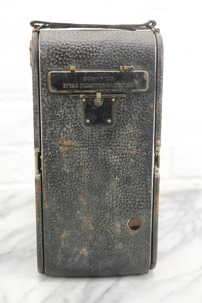 This antique Eastman Kodak No. 3A Autographic Model C folding camera was manufactured in Rochester, New York, USA in 1921. It is in fair condition with lots of dust and wear consistent with age and heavy use. This camera takes Kodak Autographic Film No.A-122. The camera is equipped with a Kodak Anastigmat 170mm f/6.3 aperture lens. The bellows are difficult to fold out. The shutter appears to be jammed.