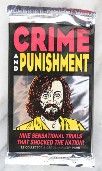 You're buying THREE (3) packs of Crime and Punishment True Crime collectible trading cards produced by Eclipse in 1992. Each pack contains twelve collectors cards, featuring court room sketches and write ups on "nine sensational trials that shocked the nation!" The wrapper features Charles Manson.