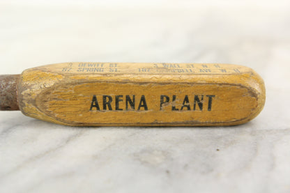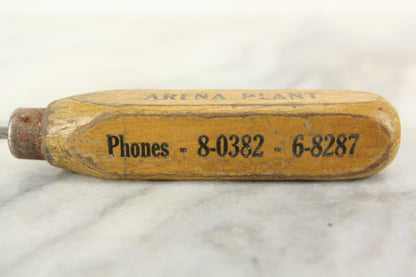 Here is a great vintage ice pick tool from the Economy Ice Company's so-called Arena Plant. It is also marked "Phones - 8-0382 - 6-8287" along with several addresses where the company likely had locations. I have been unable to locate more information about Economy Ice Company online, though one search result suggested they may have been located in Springfield, Illinois in the 1950s. The ice pick is in good condition with signs of use and wear which can be seen in the photographs.