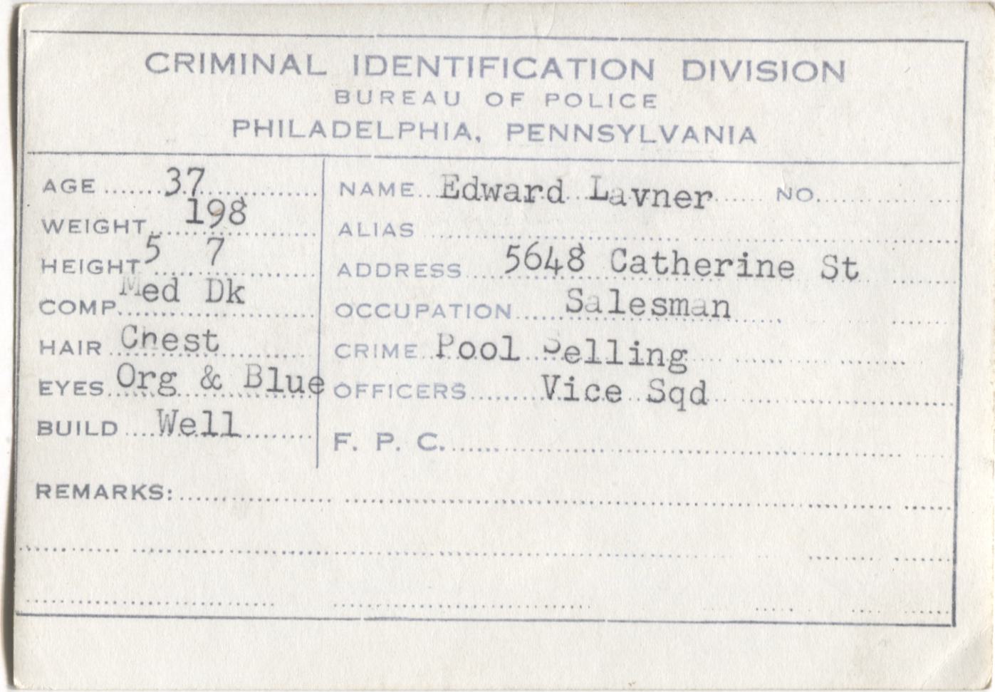 Edward Lavner Mugshot - Arrested on 10/7/1949 for Poolselling