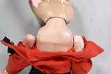 Here is a great vintage Effanbee Patsyette Doll that measures 10 inches. It is made of painted composition and has a red shirt and black pants. There is significant chipping and wear in the paint on the composition, but the doll is still quite charming. The head and limbs are securely connected to the body of the doll.