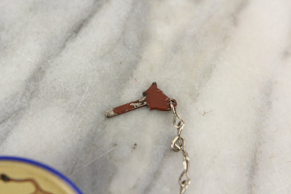 Here is an awesome antique toy magic trick called El Torero, which is Spanish for the Bullfighter, manufactured by Franco out of New York, United States. It includes the original box. The toy works as expected: a bull's head pin is inserted into a small hole on the toy, and a lever on the side is pulled. When pulled, the bullfighter's sword swings around so fast that it appears to go right through the bull's head. It is a simple and effective illusion that would be fun for kids. It is in good condition. The box shows wear.