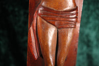 Here is an antique wood folk art crucifix. Jesus Christ is hand carved. There is normal wear and tear to the wood. It is easily hung by an eye hook on the back.
