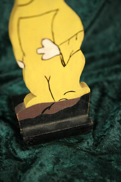 Here is a very charming hand painted and hand cut wooden folk art door stop in the likeness of the dwarf Dopey of Walt Disney's Snow White and Seven Dwarfs fame. This doorstop measures 11" in height.