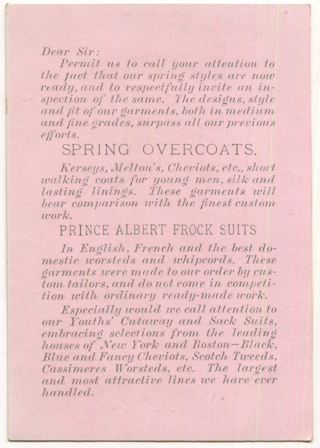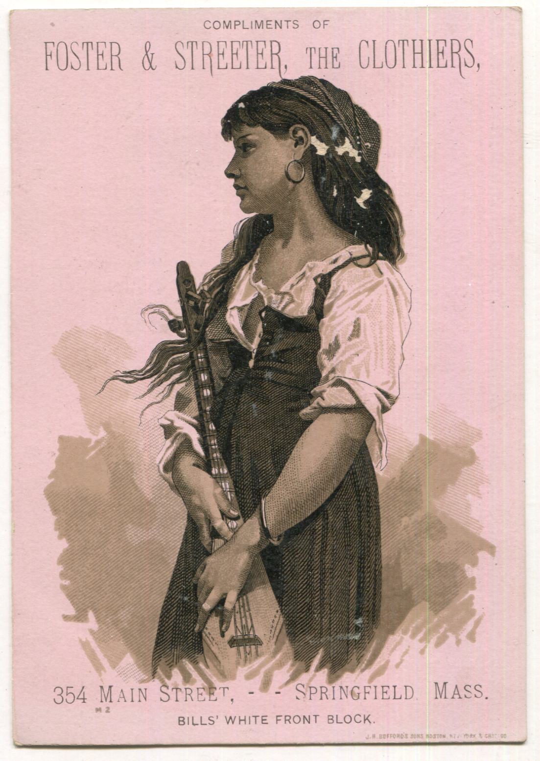 Foster & Streeter Clothiers, Springfield, MA Antique Lithographed Trade Card