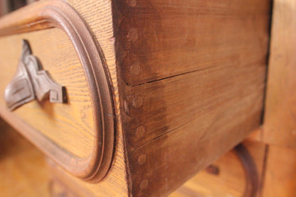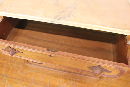 Here is a lovely antique four drawer country style pine dresser with a unique wooden top painted to look like marble. This charming piece features knapp joints on the drawers, dating it to the late 1800s. It has decorative, carved wood pulls, though three of them are damaged (please see photographs). The drawers open and close with ease. There is a split in the wood of the top toward the back left, but the top is very stable.