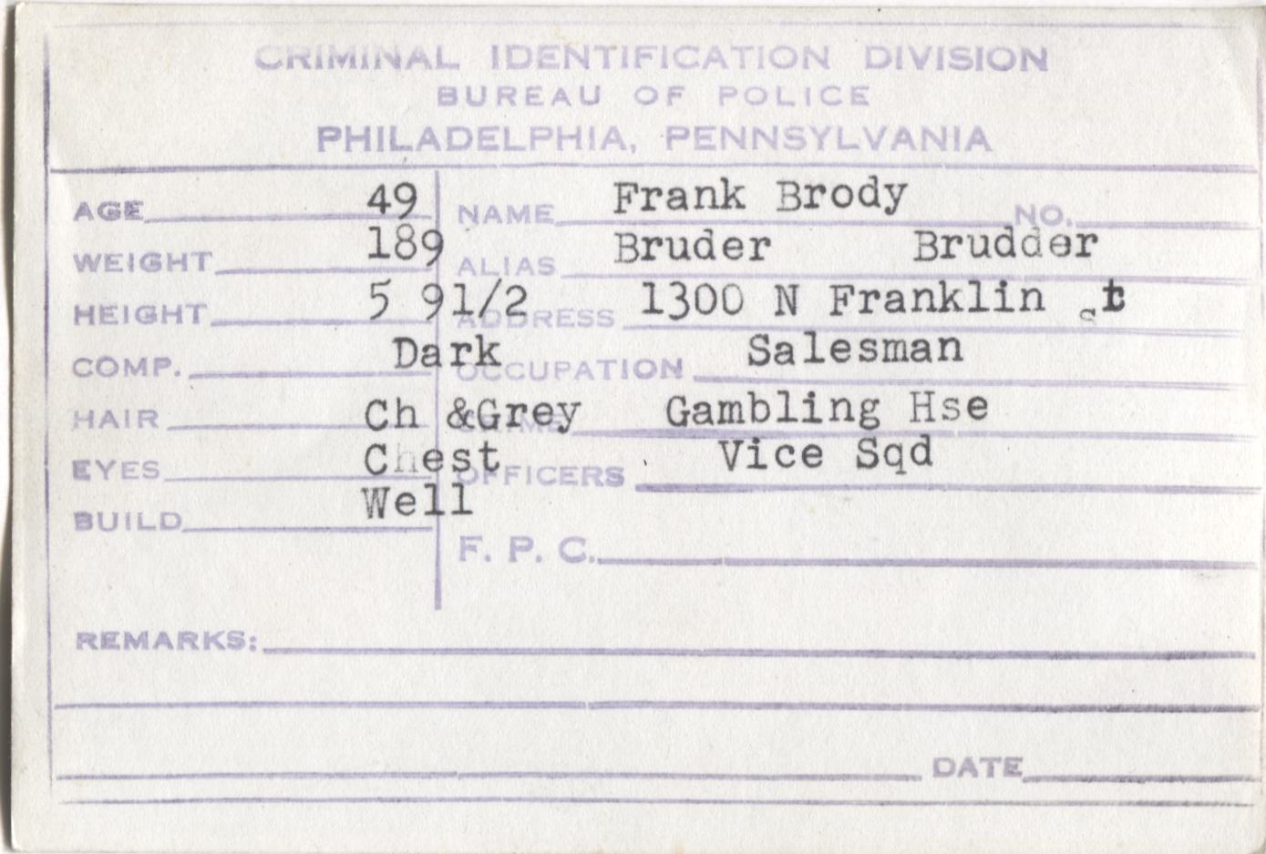 Frank Brody Mugshot - Arrested on 11/22/1947 for Running a Gambling House
