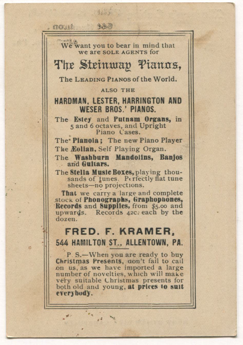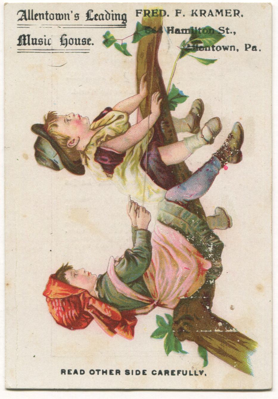 Fred F. Kramer Music House, Allentown, PA Antique Lithographed Trade Card