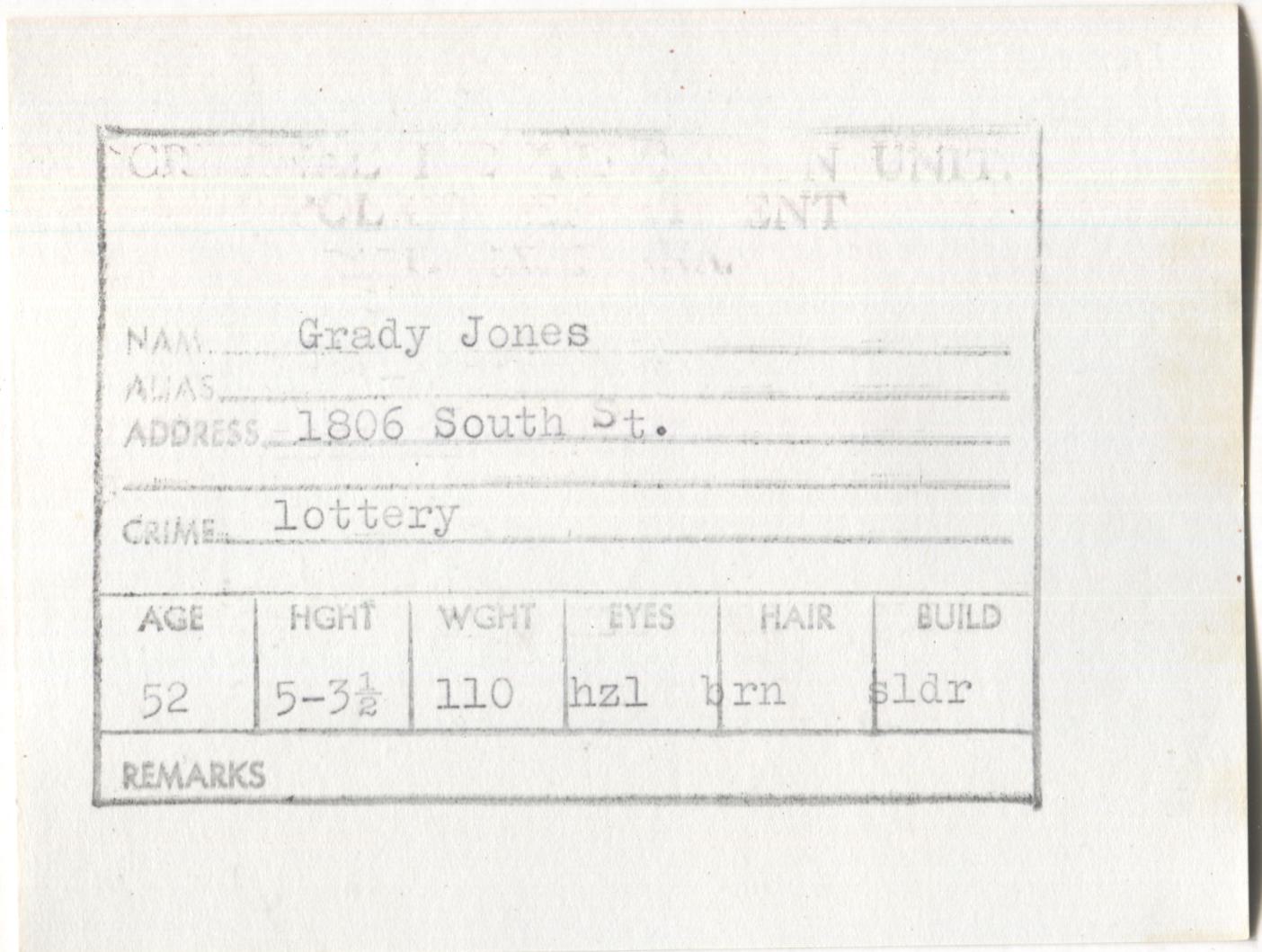 Grady Jones Mugshot - Arrested on 6/14/1961 for Illegal Lottery