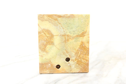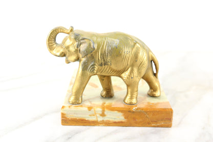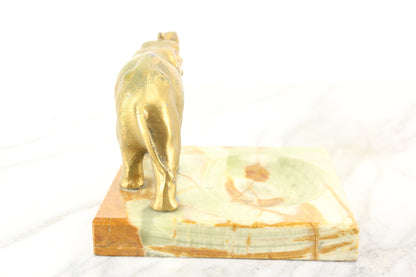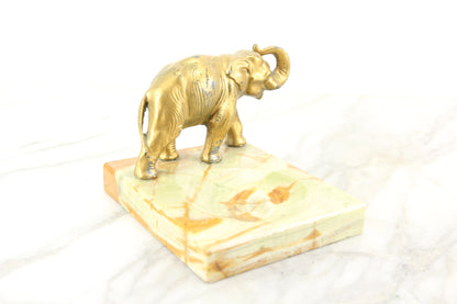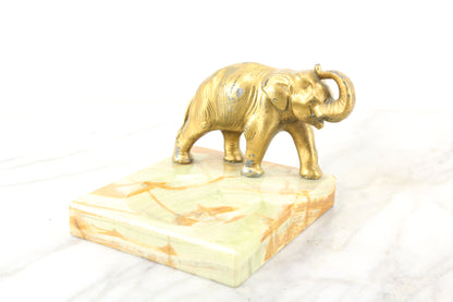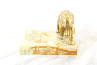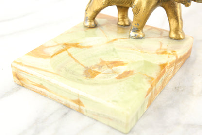 Here is a lovely marble dish with a golden metal elephant proudly standing on it. It would be great as a tip tray or leave-a-penny tray in a bar or store, or perhaps as a ring dish on a dresser. It is in lovely condition with some minor signs of wear in the marble and some wear in the gold paint on the elephant.