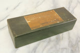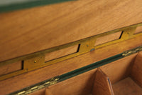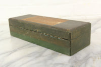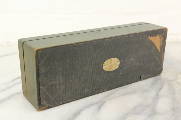Here is a charming little wooden storage box with lovely green paint and an applied ship motif on the hinged lid. This long and narrow box features four divided compartments inside, as well as a brass panel to allow for labeling of the four compartments. The pasted ship image on the lid shows significant wear. The box is in good condition with normal signs of wear.