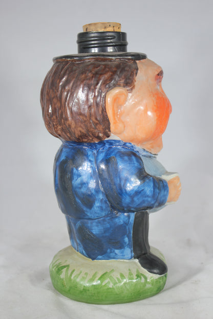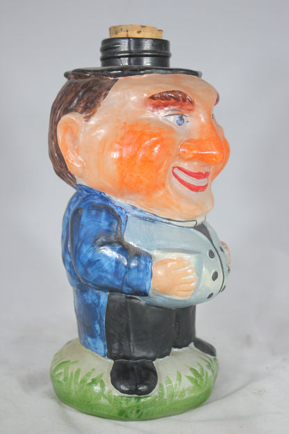 This figural glass bottle appears to be hand painted in bright and vibrant colors. It depicts a jolly, portly man holding a mug and sporting a cheeky grin. The bottle has a cork in the top. It looks like there may have been a screw on cap at one point, likely in the shape of a hat, but that is missing.
