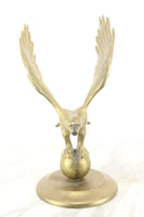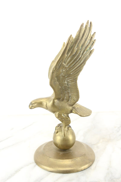 Here is an incredible brass (possibly bronze) statue of a soaring eagle with wings stretched high in the air. This classic piece of Americana has nice patina in the metal and is in good condition. It would make a great shelf piece or desk display.
