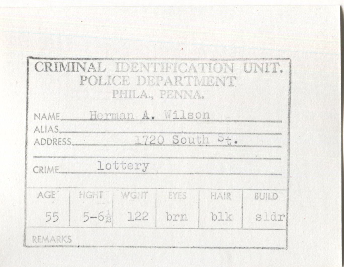Herman A. Wilson Mugshot - Arrested on 6/14/1961 for Illegal Lottery