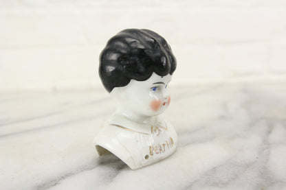Here is a very lovely antique porcelain doll head marked with the pet name "Bertha." The doll head is nicely painted and features gold accents and blue eyes. The doll head is in good condition with no chips or breaks, other than a small chip on the inside of the base that can only be seen from the inside. Bertha could use a thorough cleaning.