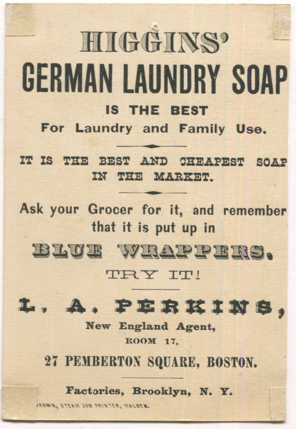 Higgins' German Laundry Soap, Booklyn, NY Antique Trade Card - 3" x 4.5"