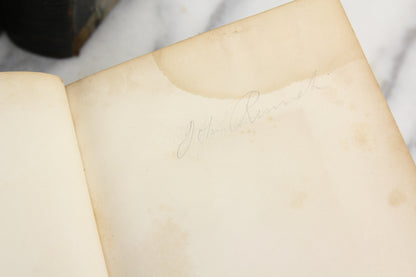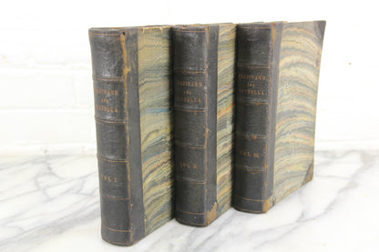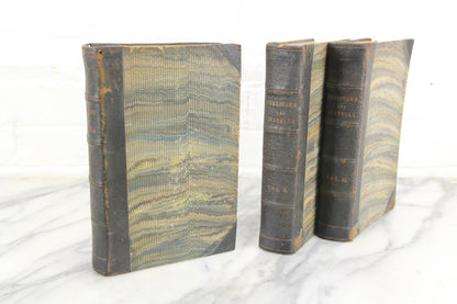 Here is an a lovely complete three volume set of The History of the Reign of Ferdinand and Isabella, the Catholic by William H. Prescott, 10th edition. These books were published by Charles C. Little and James Brown in 1844, having originally been copyrighted in 1837. They were printed in Cambridge, MA by Metcalf, Keith, and Nichols, printers to The University. These leather bound books have nice marbled covers. They are in good condition with signs of wear from normal handling and use, including some areas of light to moderate water damage along some page edges and corners. The bindings of the books are solid. A previous owner signed their name in the front page.