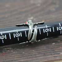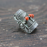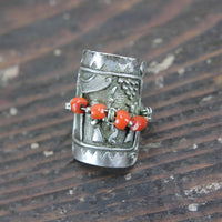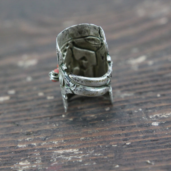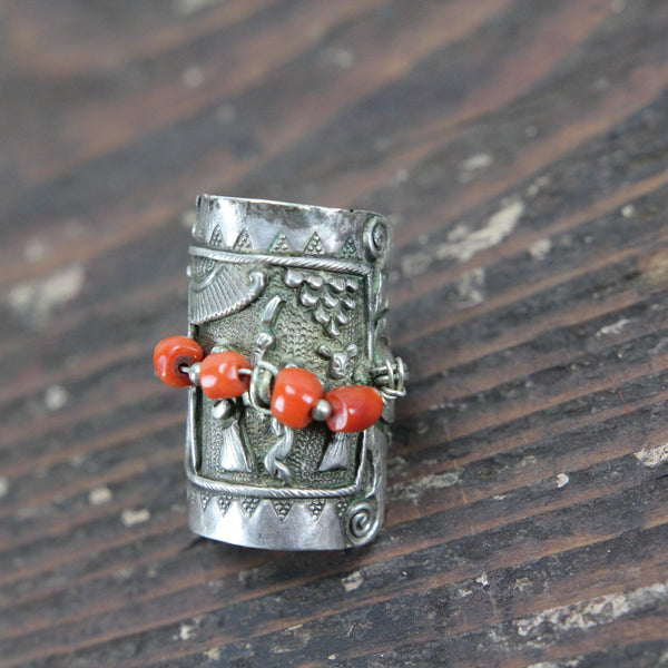 Here is a lovely sterling silver ring of likely Native American origin. The ring is approximately size 7, but can be adjusted to be slightly larger or slightly smaller. It features an intricate design that appears to be a scene with animals. It also features four small coral beads attached with wire to the front of the ring. One of the wires holding these beads is shorter than the other, and may be less secure, but is holding just fine. The ring is in good condition.