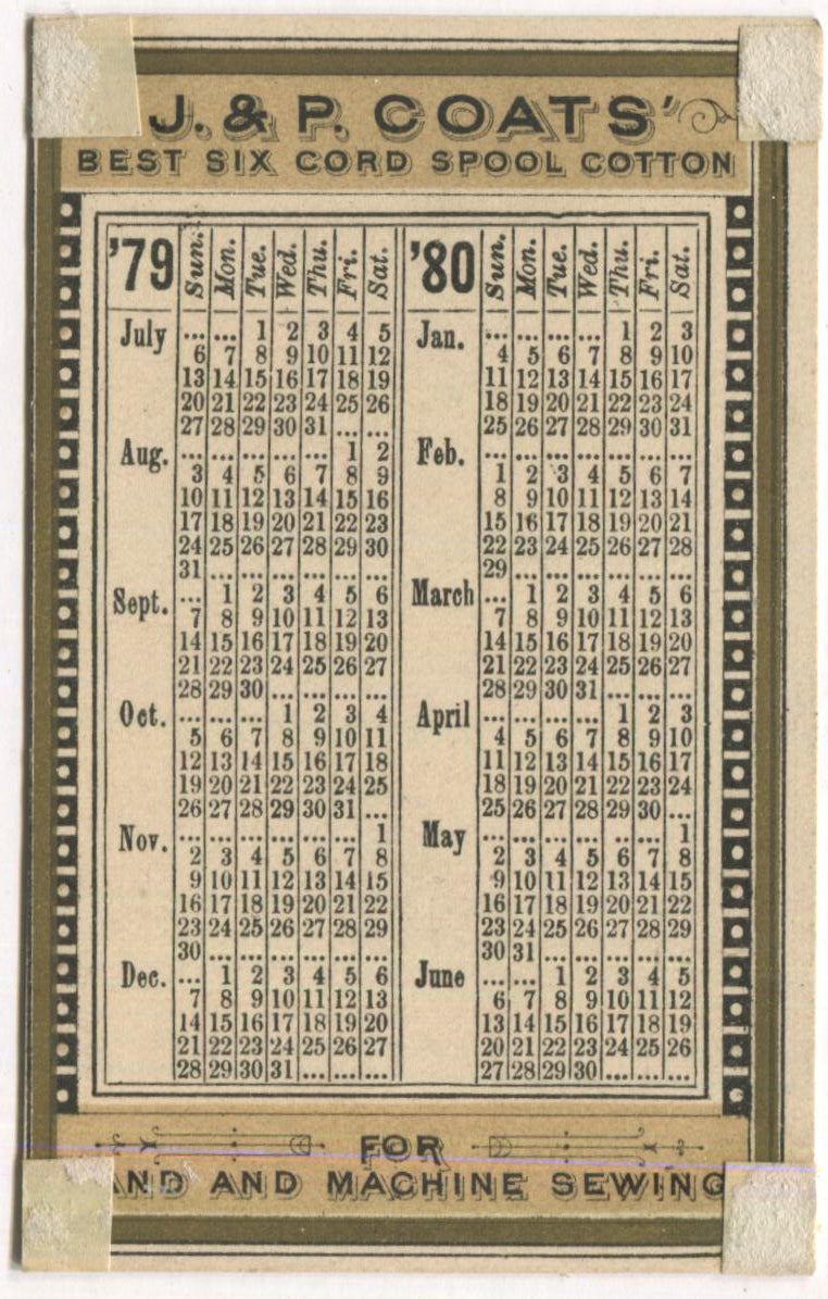 J&P Coat's Six Cord Spool Cotton Antique Trade Card 1879 Calendar- 3.75" x 2.5"