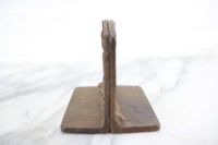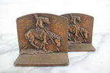 These copper-toned antique cast iron bookends feature the likeness of James Earle Fraser's famous "End of the Trail" sculpture, which depicts a weary Native American Indian warrior returning home on his horse. This pair of bookends is in good condition with no chips, cracks, or breaks and have a nice patina throughout.