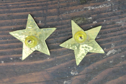 Here is a lovely pair of vintage sterling silver and brass post earrings in the form of stars. They are marked with the Jeep Collins hallmark, as well as a copyright mark, a sterling mark, and a brass mark. The earrings require pierced ears to be worn. The total weight is 0.7 ounces. The earrings each measure approximately 1.75" x 1.75"