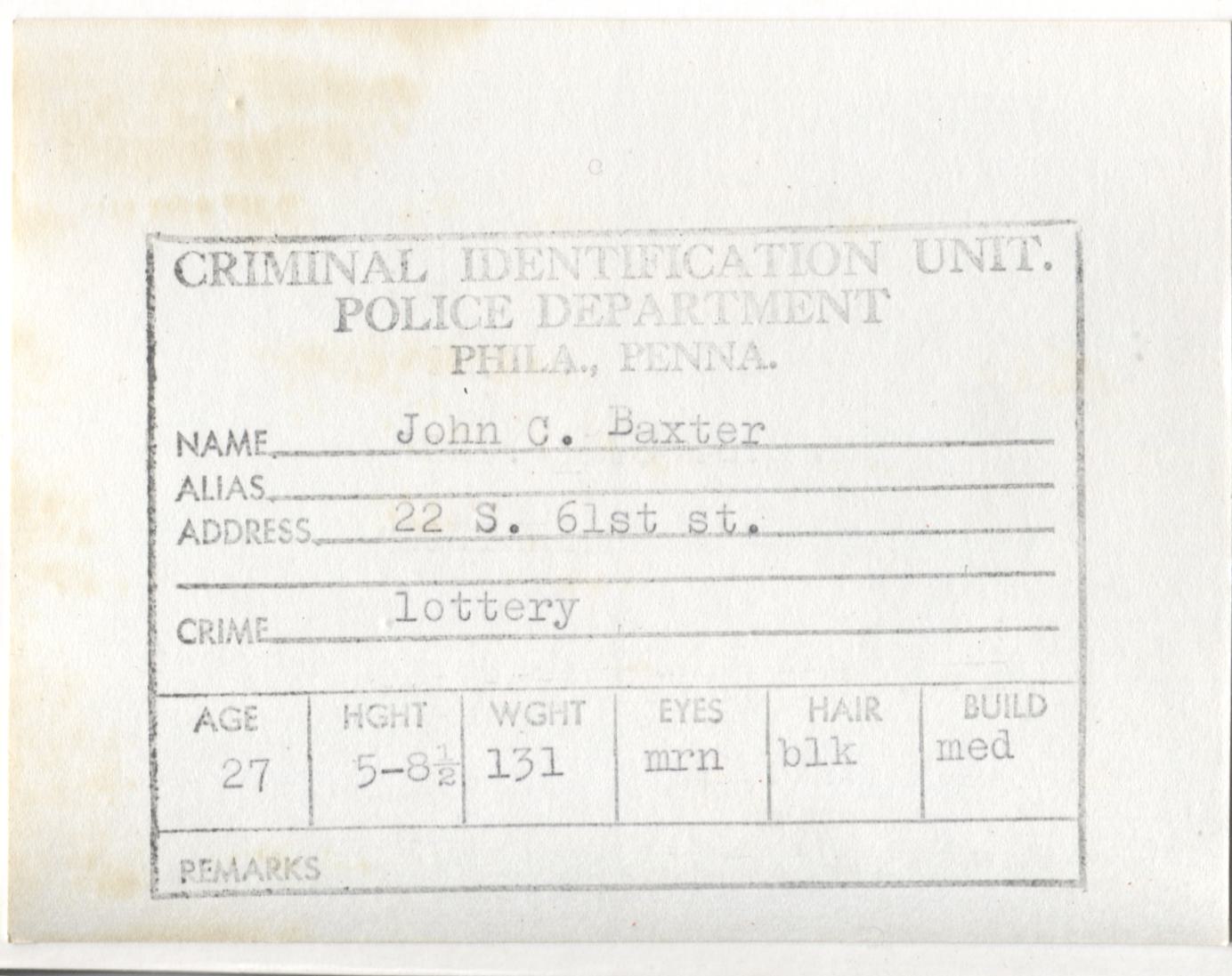 John C. Baxter Mugshot - Arrested on 6/14/1961 for Illegal Lottery