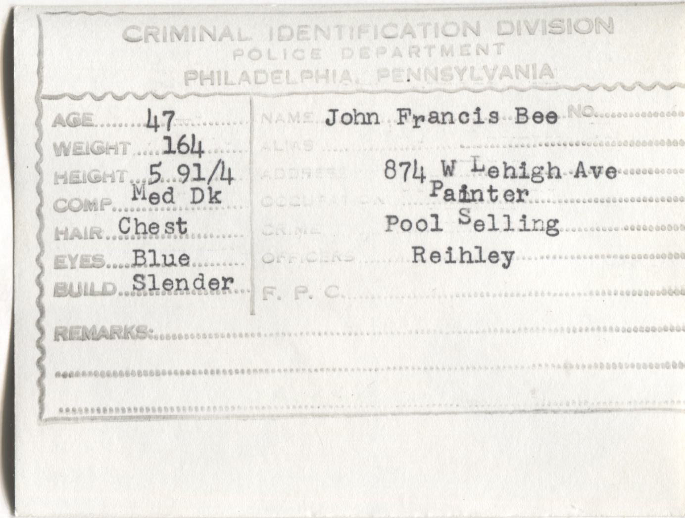 John Francis Bee Mugshot - Arrested on 4/28/1955 for Poolselling