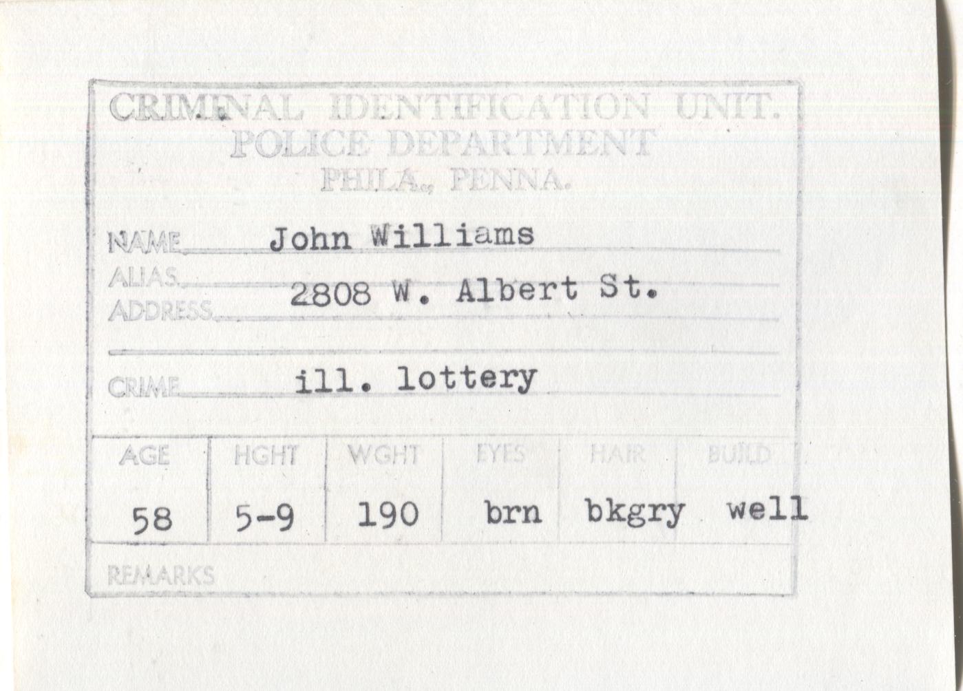 John Williams Mugshot - Arrested on 11/26/1960 for Illegal Lottery