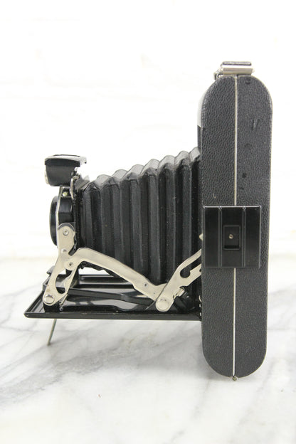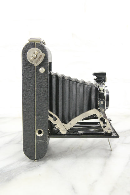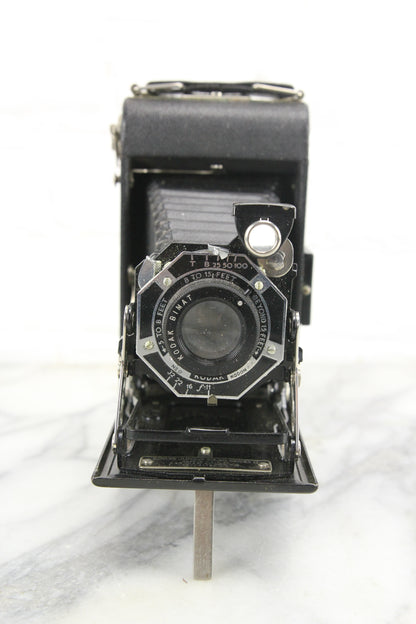 This antique Eastman Kodak Junior Six-20 Series II folding camera was manufactured in Rochester, New York, USA. It is in good condition with some dust and wear consistent with age and use. This camera takes Kodak 620 film. The camera is equipped with a Kodak Bimat f/11 aperture lens. The shutter appears to work normally.