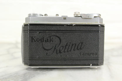 This antique Kodak Retina Ia 35mm folding camera was manufactured in in 1951. It is in good condition for its age and shows some wear from use. This camera takes 35mm film. It features a Schneider-Kreuzuach Retina-Xenar f/3.5 50mm lens. The shutter appears to function normally.