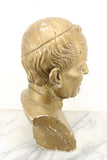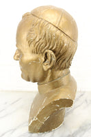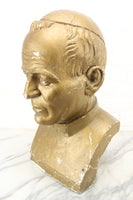 This large golden plaster or chalkware bust of a Pope, Cardinal, Bishop, or other Catholic religious figure is one of my favorite pieces of religious art in my collection. The man wears a slight smile and has kind eyes and appears to be dressed in traditional Catholic garments of a higher ranking priest. The condition of this bust is fair, as there is chipping in the plaster and in the paint throughout. Please see the photographs for a complete understanding of this item's condition.