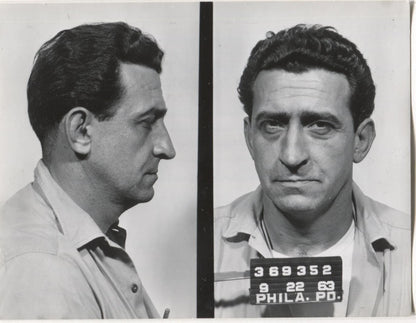 Here is an opportunity to own a piece of true crime history! This true original mugshot photograph includes arrest and suspect information on the back side. It comes in a transparent archival hard plastic case to protect and display it. The image shown here is an exact scan of the mugshot and back side you will receive.
