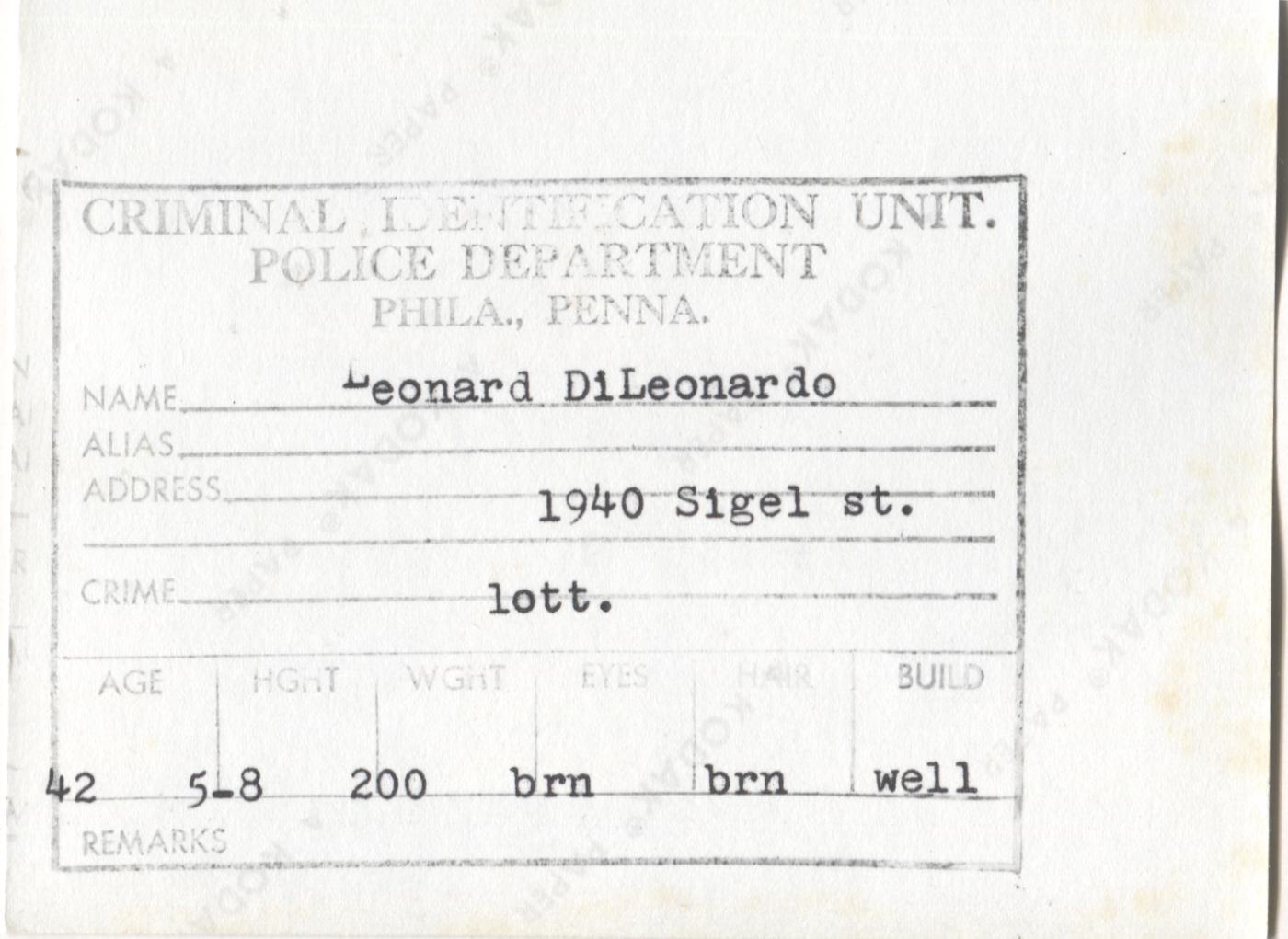 Leonard DiLeonardo Mugshot - Arrested on 4/16/1964 for Illegal Lottery