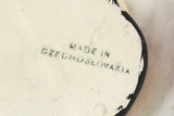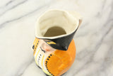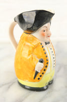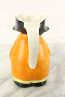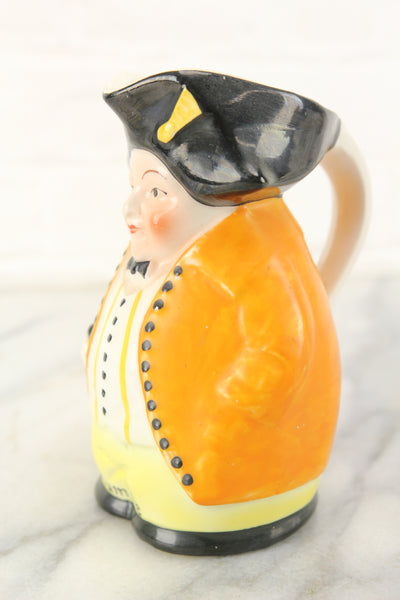 Here is a lovely vintage porcelain hand painted filipot creamer, also known as a Toby mug or Toby jug. It features the likeness of a cheeky and plump man in an orange overcoat with a swagger stick in his hand. The brim of the man's hat is pointed for easy pouring of cream or syrup. The piece has a handle on the back to assist with pouring. The paint is worn in some areas, but overall is in nice condition.The bottom is marked Made in Czechoslovakia. The word "Bumble" is printed on the lower portion of the man.