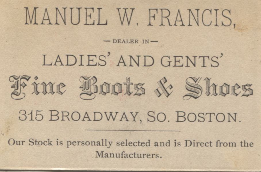 Manuel W. France Fine Boots and Shoes Antique Trade Card, Boston, MA - 2" x 3"