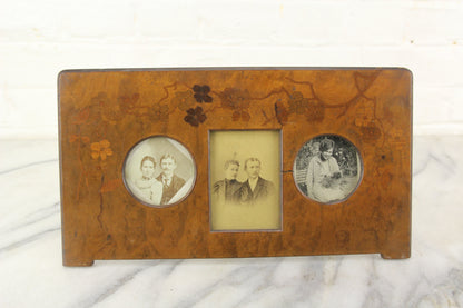 Here is a beautiful antique wood marquetry inlaid frame with a lovely floral motif throughout. It features two round picture frame holes on the left and right and a rectangular frame hole in the center. The frame is meant to sit on a table and has a kickstand on the back. A hanger could be added to hang it on the wall. The frame includes three antique pictures - two of couples and one of a woman and a small dog. The frame is in good vintage condition. There is a small and stable crack between the center picture window and the right one, which you can view in the photographs. The circular picture windows have a diameter of 2" and the larger rectangular picture window measures 2.25" L x 3.25" H.
