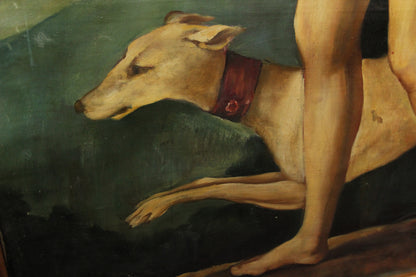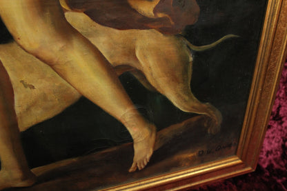 Here is an opportunity to own a breathtaking and awe-inspiring oil on canvas painting of Diana the Huntress that measures in at an insane 44" x 53.5." This masterfully done vintage artist study is based on the anonymous 1550 original which currently hangs in the Louvre. It depicts the ethereal Roman goddess Diana, patroness of the Moon, with the face of Diane de Poitiers, a mistress of King Henry II. This piece is signed by the artist, but I'm unable to quite decipher the signature. But in scale, subject, and quality, this painting absolutely dominates, and if you've got the right wall, it will make the room.