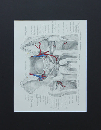 This anatomy plate print was taken directly from the 19th century book Henke's Atlas of Surgical Anatomy, A Series of Plates Illustrating The Application of Anatomy to Medicine and Surgery as translated and edited by W.A. Rothacker, M.D., who was pathologist to Cincinnati Hospital and lecturer on pathological anatomy in Miami Medical College. The book was published in New York by John Beacham. The volume this print was pulled from had no date of publication, however a handwritten note on the first page read, “Clara M. Smith, Springfield, Mass., 5-21-1897,” dating this print to the 1890s, at the latest. This is an original antique, not a copy – it was pulled directly from the book. Any coloring was done by hand at the time of publication.