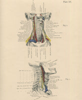 This anatomy plate print was taken directly from the 19th century book Henke's Atlas of Surgical Anatomy, A Series of Plates Illustrating The Application of Anatomy to Medicine and Surgery as translated and edited by W.A. Rothacker, M.D., who was pathologist to Cincinnati Hospital and lecturer on pathological anatomy in Miami Medical College. The book was published in New York by John Beacham. The volume this print was pulled from had no date of publication, however a handwritten note on the first page read, “Clara M. Smith, Springfield, Mass., 5-21-1897,” dating this print to the 1890s, at the latest. This is an original antique, not a copy – it was pulled directly from the book. Any coloring was done by hand at the time of publication.