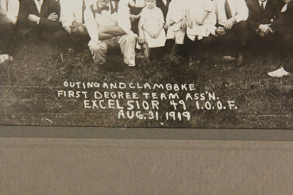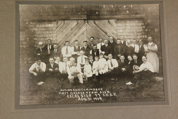 Here is one of two great matted group photographs I have in my collection of the Independent Order of Odd Fellows (I.O.O.F.) Excelsior 49 First Degree Team Association outing and clambake dated August 31, 1919.